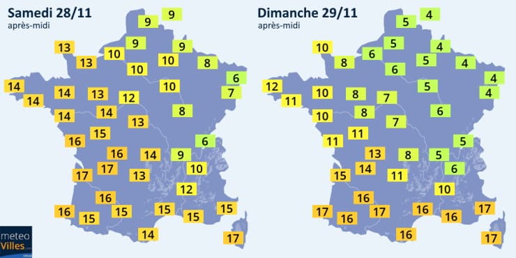 La journée de samedi sera encore particulièrement douce sur la moitié ouest de la France et les régions méditerranéennes avec des maximales s'établissant souvent entre 14 et 17°C. Une petite fraîcheur concernera le nord-est. Le refroidissement interviendra surtout dès dimanche 29 novembre avec des maximales qui ne dépasseront plus 4 à 6°C sur les régions du nord et de l'est tandis qu'il fera encore 15 à 17°C de l'Aquitaine à la Méditerranée.
