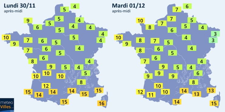 Prévisions des températures maximales les lundi 30 novembre et mardi 1er décembre 2020 - Météo Villes