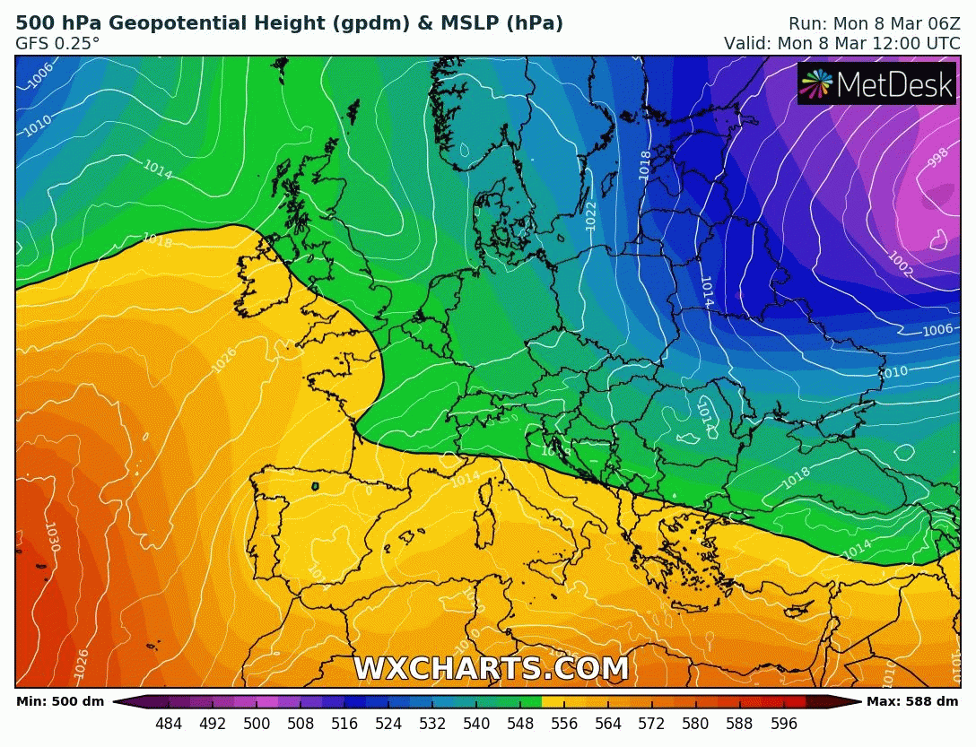 Animation des géopotentiels entre le lundi 8 et le samedi 13 mars 2021 – Modèle GFS via WX CHARTS