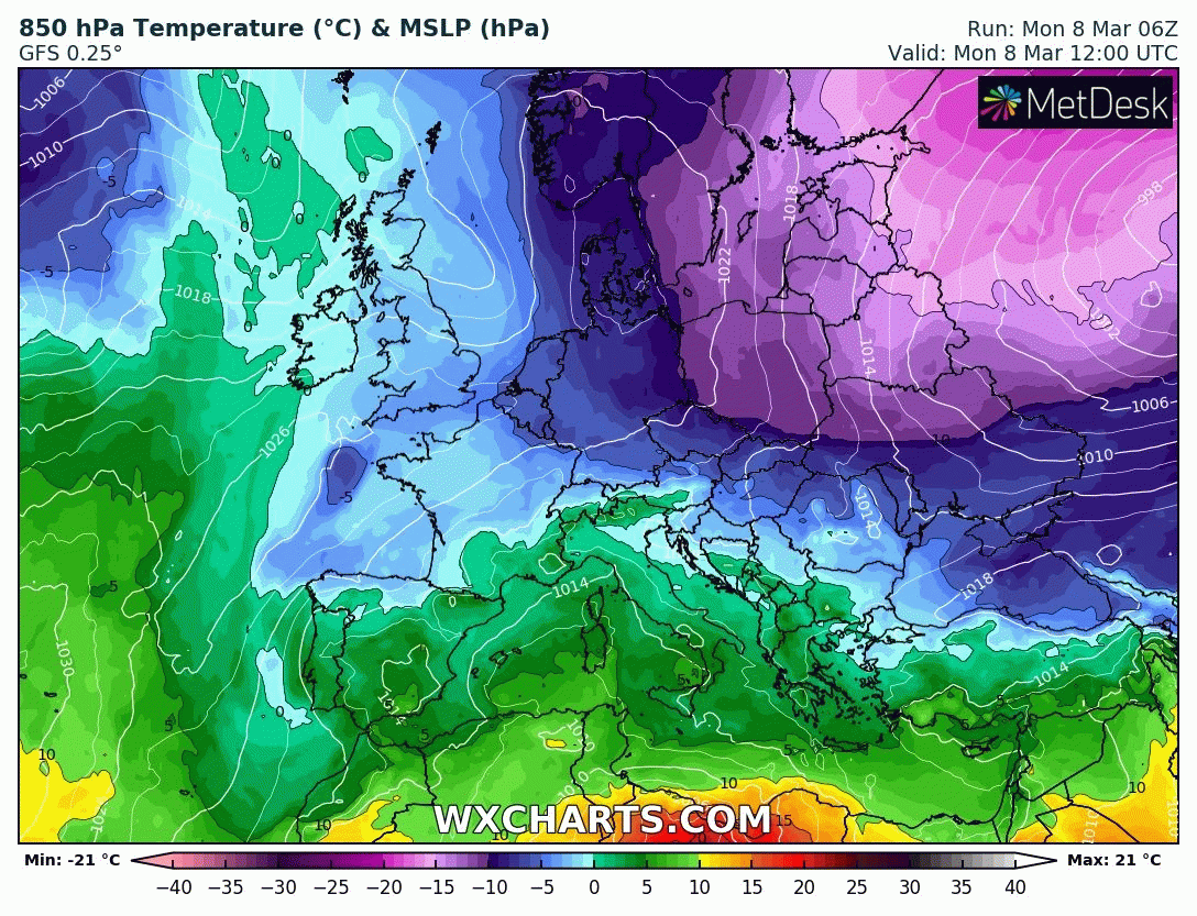 Animation des températures à 850 hPa entre ce lundi 8 et jeudi 11 mars sur l’Ouest de l’Europe – Modèle GFS via WX CHARTS