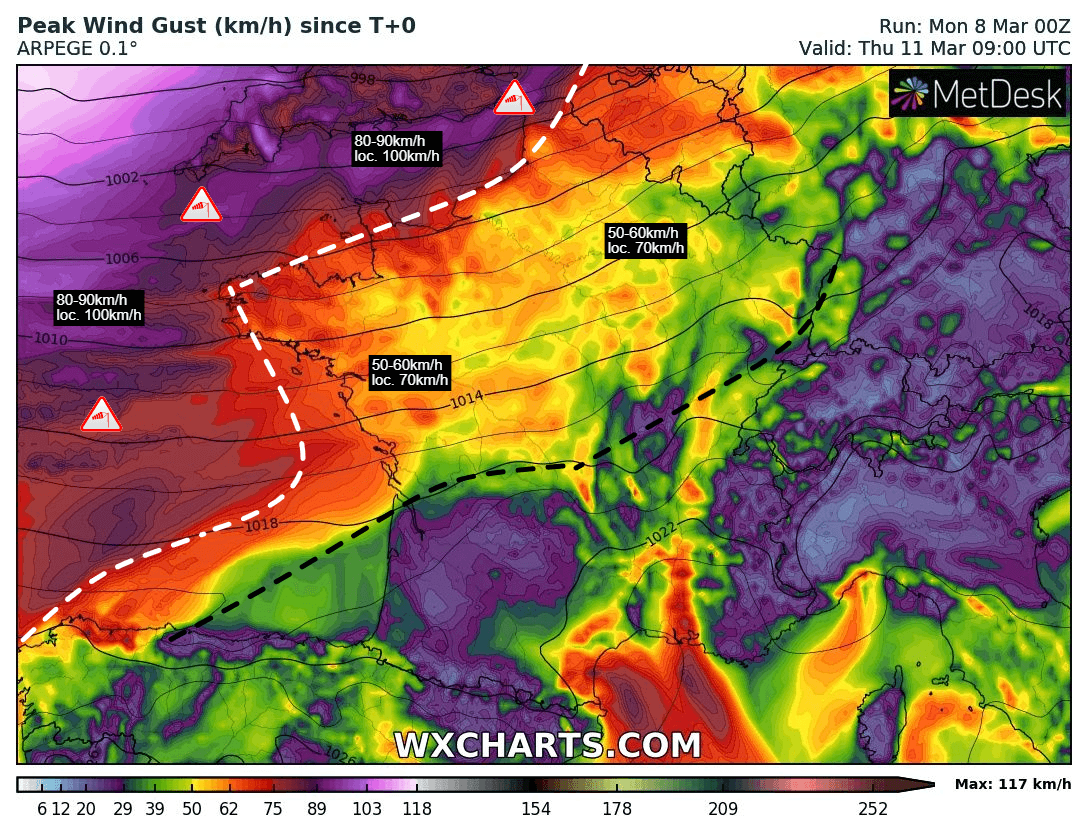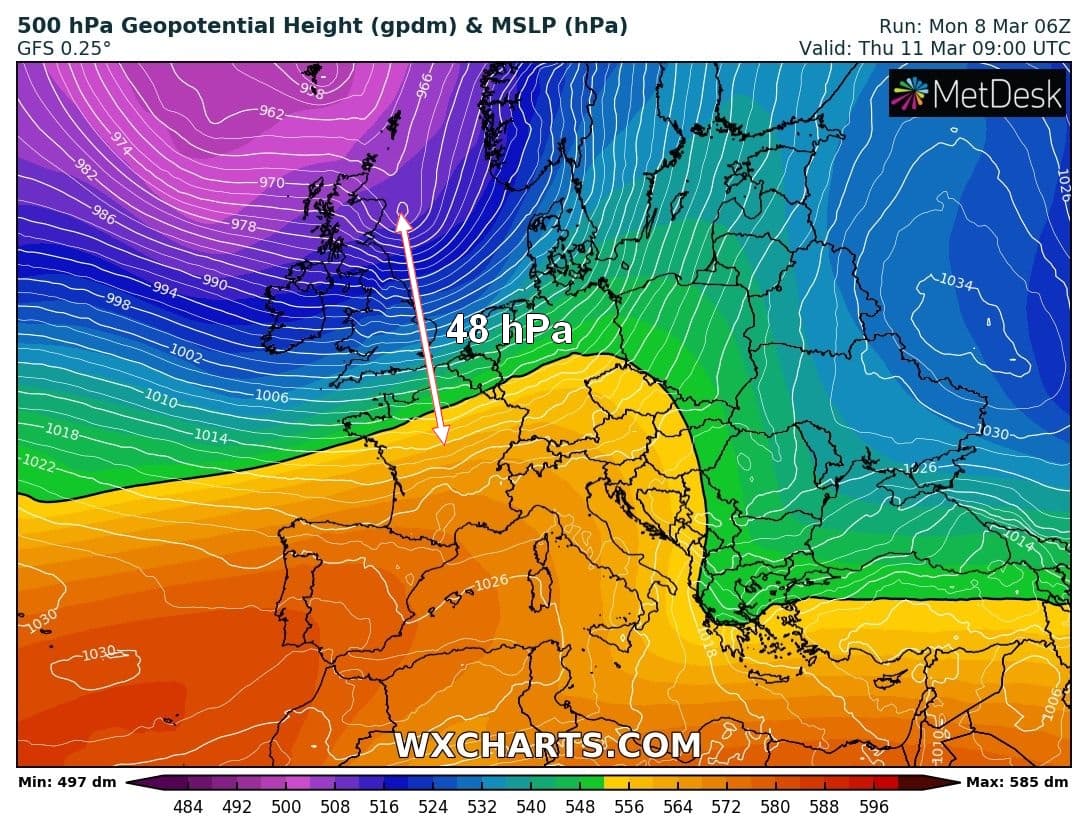 Important gradient isobarique entre les îles britanniques et la France ce jeudi 11 mars – Modèle GS via WWX CHARTS
