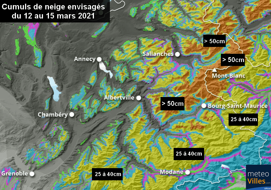 Les quantités exactes resteront là aussi à préciser mais il est probable que les cumuls dépassent les 50cm dès 1000-1200m d’altitude dans l’intérieur du Nord des Alpes entre vendredi et lundi, généralement entre 25 et 40cm sur le reste de la région.