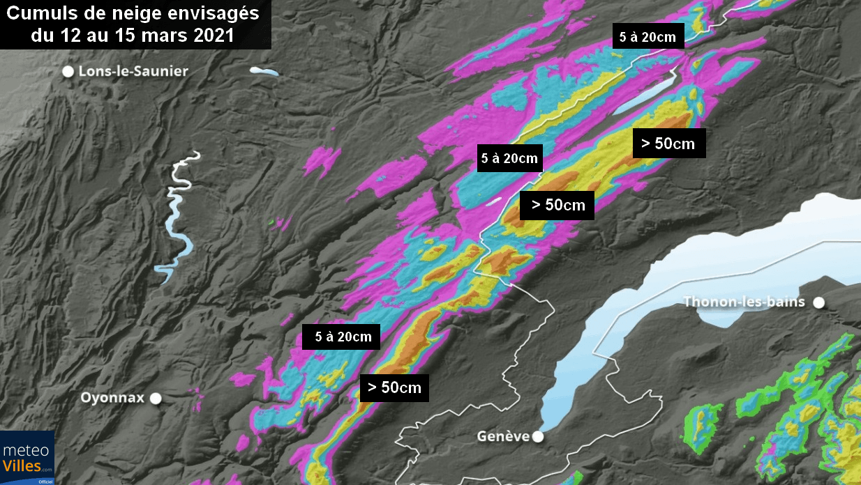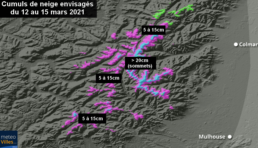 Cumuls de neige attendus en fin de semaine sur le Jura et les Vosges – via skipass, modifié par Meteo-Villes