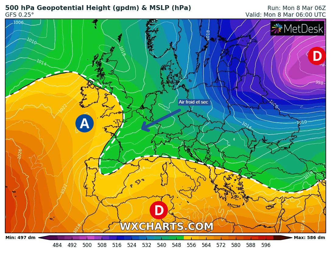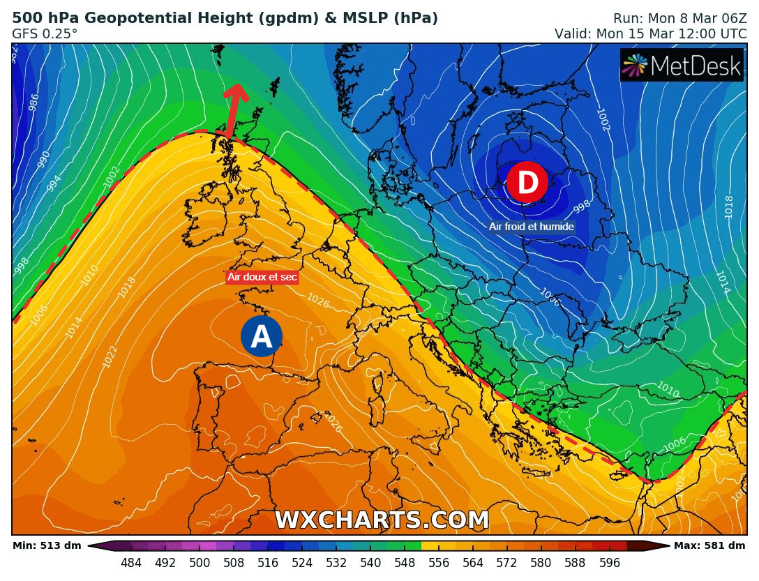 Schéma de la situation atmosphérique sur l’Ouest de l’Europe en ce lundi 8 mars 2020 – Modèle GFS via WX CHARTS