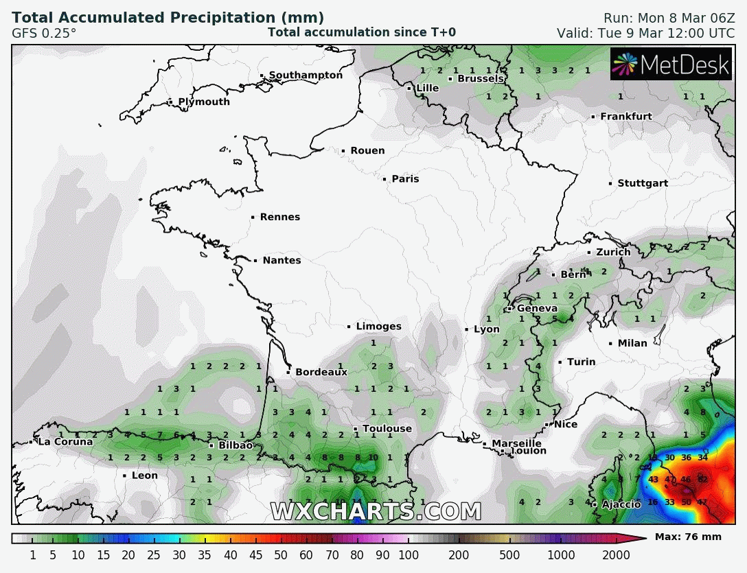 Animation des cumuls de précipitations du mardi 9 au lundi 15 mars 2021 sur la France – Modèle GFS via WX CHARTS