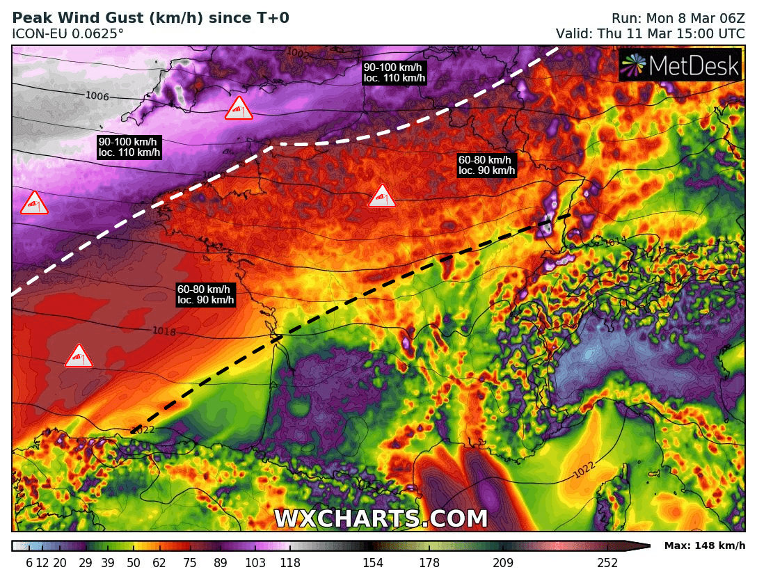 Différence d’intensité du coup de vent attendu entre Mercredi 10 et Jeudi 11 mars sur la moitié Nord – Modèles Arpèe (haut) et ICON (bas) modifié par Meteo-Villes