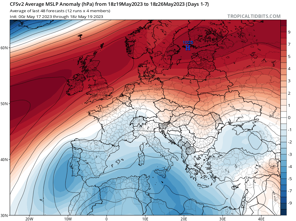 Anomalie de la pression atmosphérique - prévision du 19 au 26 mai 2023 - Modèle CFS via TropicalTidbits