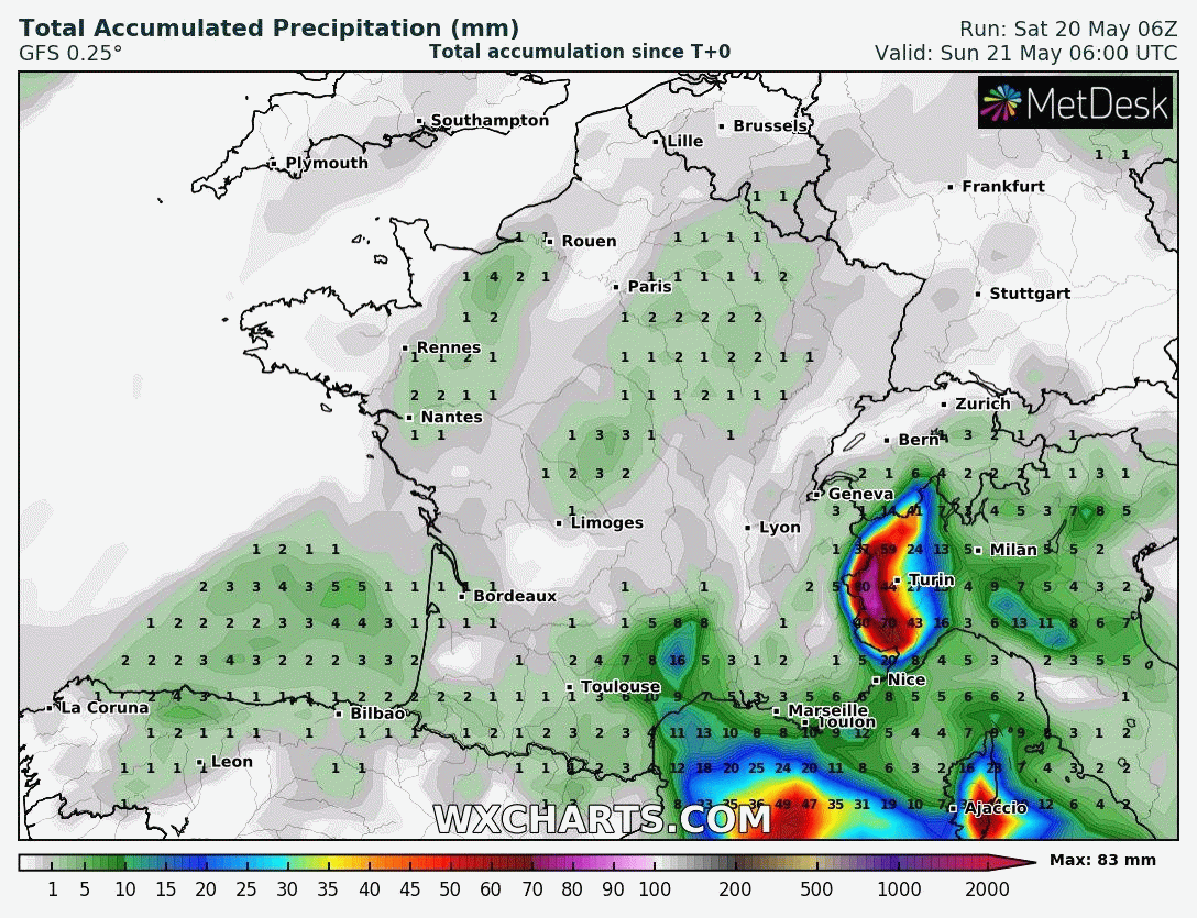 Accumulation des précipitations - modélisation du 21 au 28 mai 2023 - Modèle GFS via WxCharts
