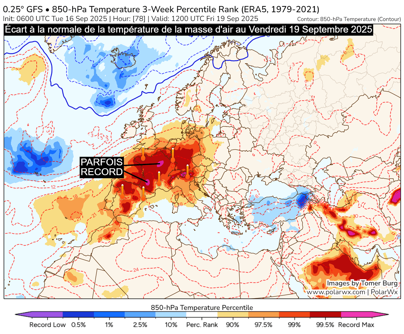 Écart à la normale de la température de la masse d'air pour le vendredi 19 septembre 2025 (rose = record) - polarwx.com