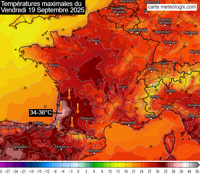 L'après-midi le plus chaud de cette semaine sera celui du vendredi 19 septembre 2025. La barre des 30°C sera probablement atteinte jusqu'en Île-de-France et dépassée dans le centre du pays. C'est au sud-ouest qu'il fera le plus chaud avec un pic remarquable pour la saison en Aquitaine. La plupart des modèles s'accordent sur des valeurs atteignant 34-35°C voire localement 36°C, notamment entre les Pyrénées-Atlantiques et les Landes. Notons que le record au delà du 15 septembre est de 35,1°C à Mont-de-Marsan. Nous serons dans les mêmes eaux.