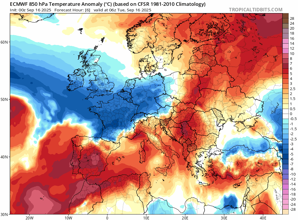 Anomalie thermique de la masse d'air vers 1500m du mardi 16 au vendredi 19 septembre 2025 - tropicaltidbits.com