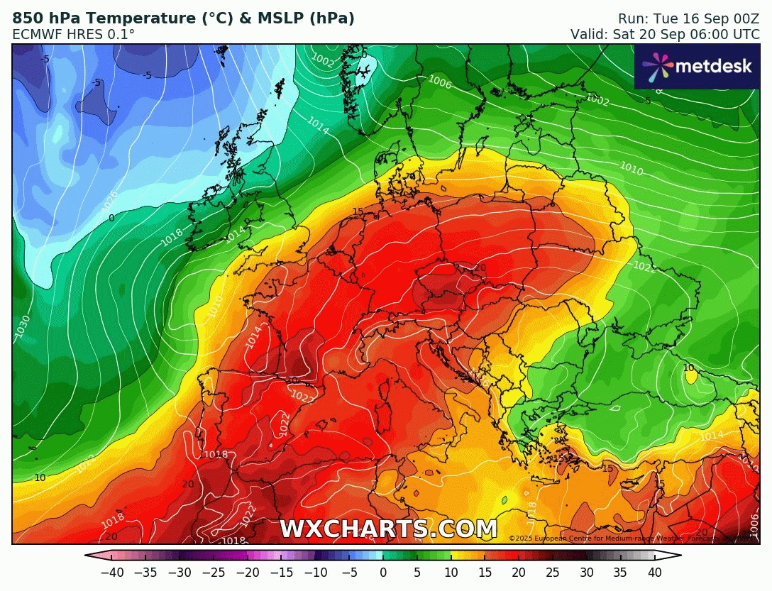 Température de la masse d'air à 850 hPa (vers 1500m) du samedi 20 au mardi 23 septembre 2025 - wxcharts.com