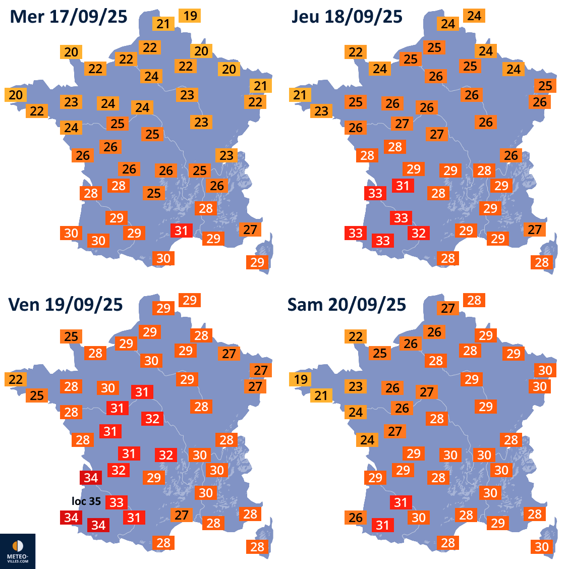 Températures maximales prévues du mercredi 17 au samedi 20 septembre 2025 - Météo Villes