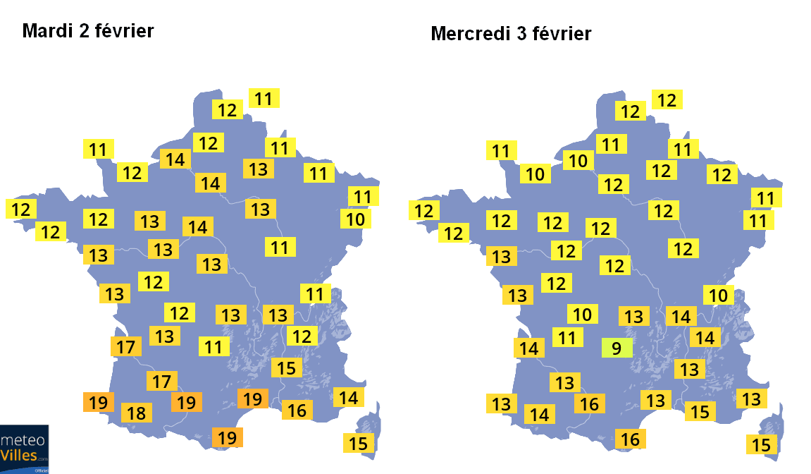 Températures maximales prévues mercredi 3 et vendredi 5 février sur la France – Météo-Villes