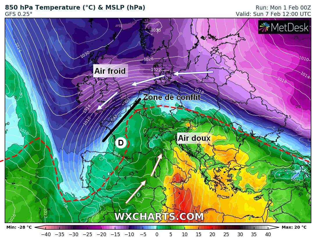 Cette dépression induira un fort conflit de masse d’air sur le pays avec la mise en place d’un flux continental entre les îles britanniques, le Nord de la France et l’Allemagne amenant de nouveau l’air froid scandinave jusqu’à nos portes. A l’avant du centre dépressionnaire le flux resterait orienté au Sud-Ouest avec un air doux persistant possiblement plus longtemps.