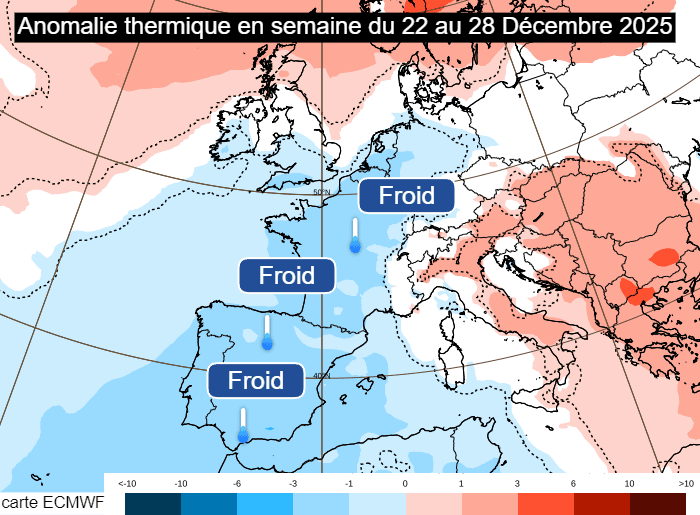 S'il n'est pour l'instant pas question d'une vague de froid - car les réserves en froid sont bien maigres sur le nord-est du continent - il est possible que ce refroidissement s'inscrive dans la durée. D'ailleurs, les modélisations d'anomalie thermique pour la semaine du lundi 29 décembre 2025 au dimanche 4 janvier 2026 virent au bleu sur une grande partie de l'Europe. Avec un anticyclone vissé sur le nord du continent, le flux d'est à nord-est pourrait se maintenir et permettre au froid de s'affirmer au fil des jours. Il est possible que la fin 2025 devienne véritablement hivernale.