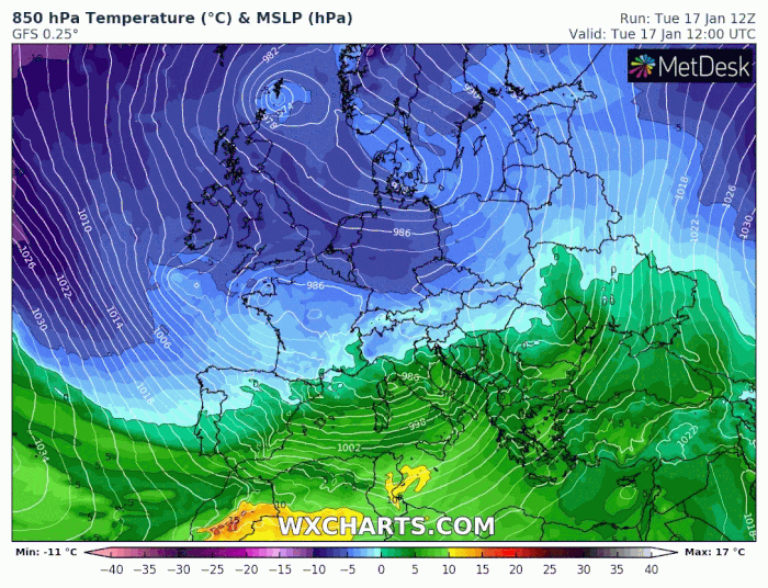 Masses d'air à 850 hPa (vers 1500 mètres) du mardi 17 au dimanche 22 janvier 2023 - via wxcharts.com