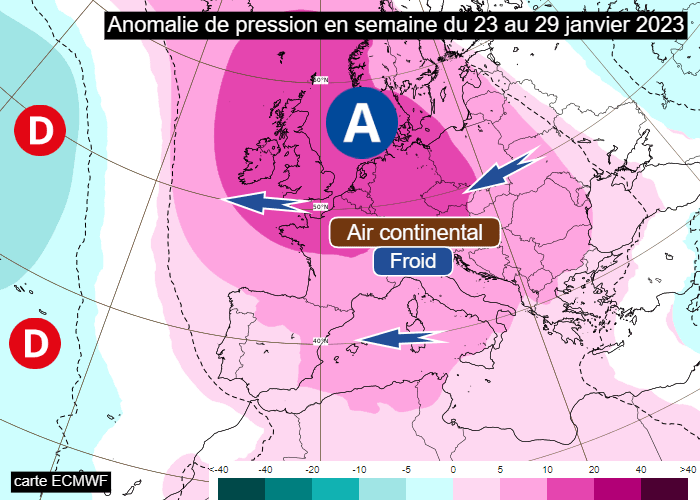 L'installation de l'anticyclone sur la Mer du Nord et la Scandinavie en seconde partie de semaine s'annonce durable. Selon les projections pour la semaine du lundi 23 au dimanche 29 janvier 2023, une anomalie de hautes pressions se distingue clairement à proximité des Îles Britanniques et de la Mer du Nord. Le vent tournant autour des anticyclones dans le sens des aiguilles d'une montre, un flux continental devrait donc dominer sur la France au cours de la semaine prochaine, continuant à drainer de l'air froid sur notre territoire.