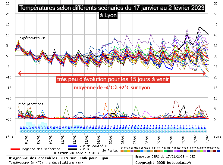 Différents scénarios de températures à Lyon du 17 janvier au 2 février 2023 – via meteociel.fr