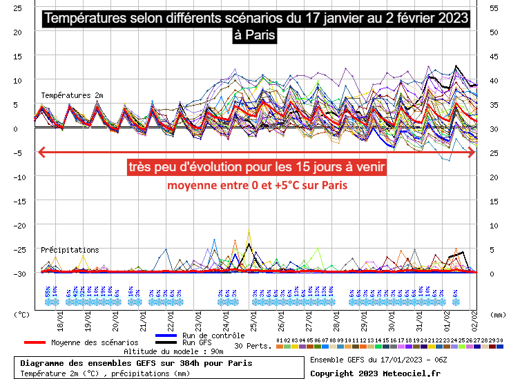 Différents scénarios de températures à Paris du 17 janvier au 2 février 2023 – via meteociel.fr
