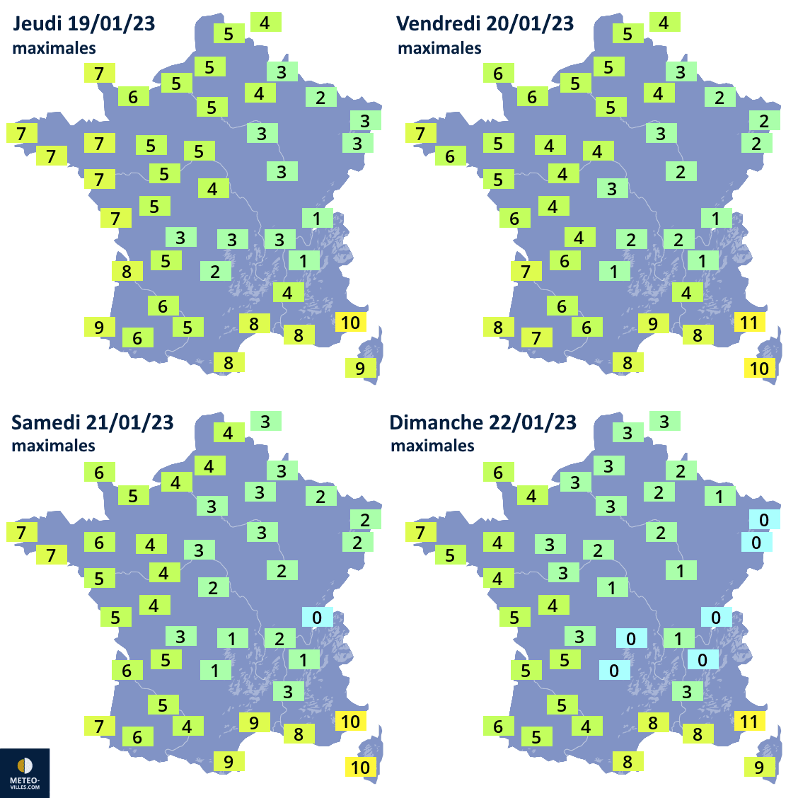 Prévisions des températures maximales du jeudi 19 au dimanche 22 janvier 2023 - Météo Villes