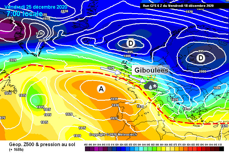 Schéma de la situation atmosphérique sur l’Ouest de l’Europe le vendredi 23 décembre – Modèle GFS via météociel.fr