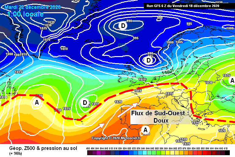 Schéma de la situation atmosphérique sur l’Ouest de l’Europe le mardi 23 décembre – Modèle GFS via météociel.fr