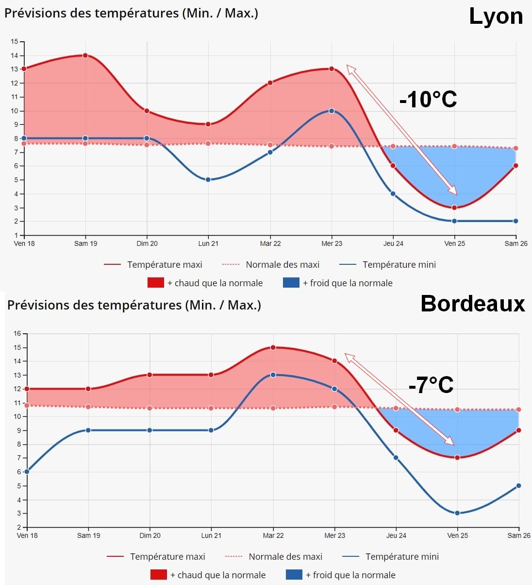 Graphique de l’évolution des températures à Lyon et Bordeaux dans les prochains jours – Météo-Villes