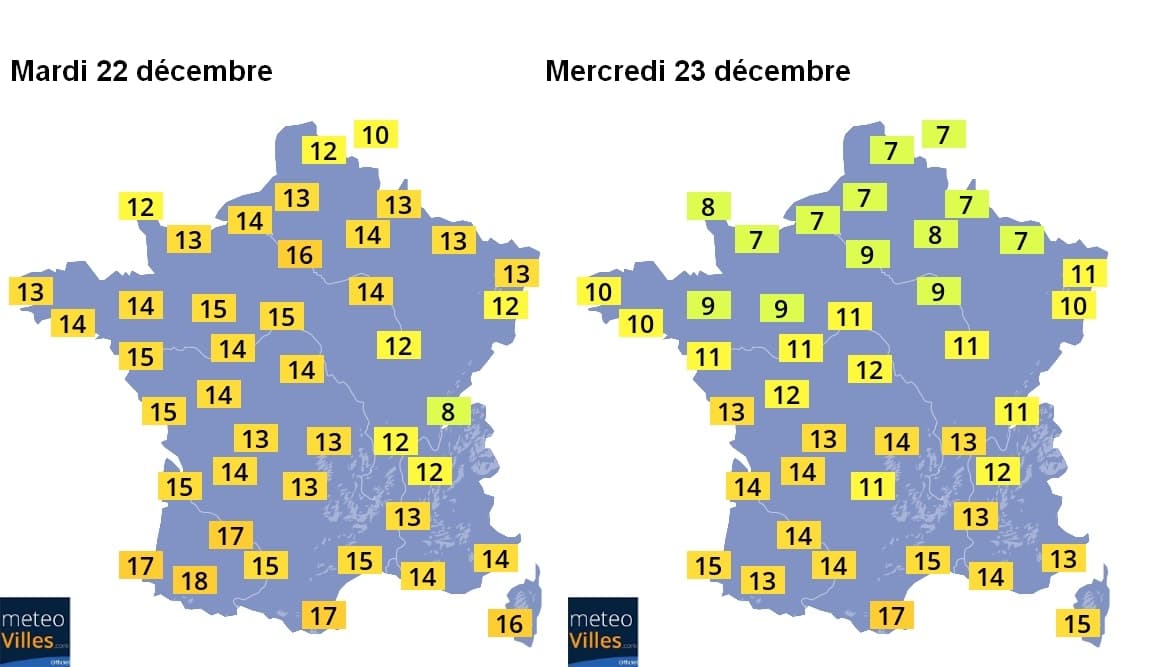Températures maximales prévues mardi 22 et mercredi 23 décembre – Météo-Villes