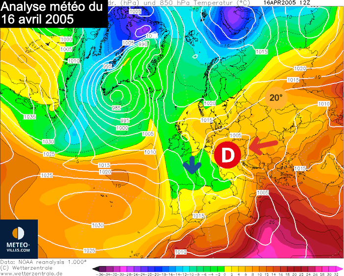 La première partie du mois d'avril 2005 est humide et fraîche voire assez froide. Déjà le 9 avril, une descente froide engendre des chutes de neige notables sur les Pré-Alpes et le Massif-Central avec des flocons tombant dès la très basse altitude voire jusqu'en plaine.