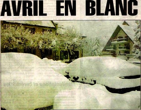 Le 24 avril, il ne fait pas plus de -1°C à Château Chinon, +1°C à Grenoble et +2°C à Lyon où il neige toute la journée. Cette neige est d'ailleurs lourde et provoque de sérieux dégâts sur une végétation déjà bien avancée.