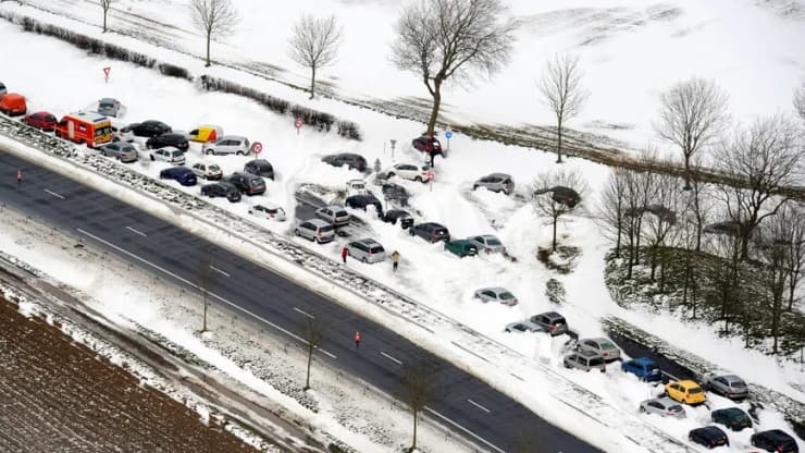 À Caen, la station mesure 22 centimètres mais les congères sont bien plus importantes. Le toit du parc des expositions ne résiste pas et s'effondre sous le poids de la neige. Sur la route, c'est la pagaille complète. Des milliers d'automobilistes se retrouvent bloqués. Certains dorment dans leurs véhicules, d'autres les abandonnent et reviennent les dégager le lendemain à grands coups de pelle.