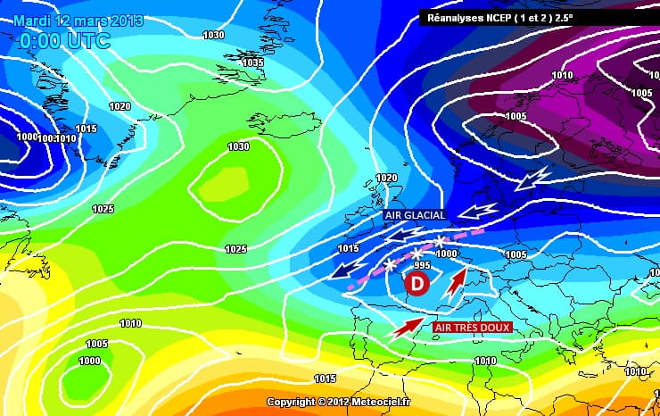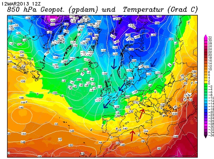 La carte des masses d'air de la journée du 12 mars 2013 est particulièrement éloquente. Elle montre la présence de l'air doux sur le sud du pays, remontant jusqu'à la frontière allemande, tandis que l'air continental glacial plongeait sur le nord-ouest de la France avec des températures inférieures à -10°C à 850 hPa (vers 1500m), des niveaux très bas aussi tard dans la saison !