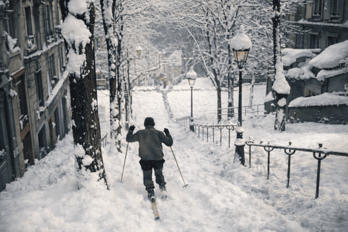 Début mars 1946, Paris s'était alors transformée en une véritable station de sports d'hiver ! De nombreux habitaient avaient chaussé les skis pour circuler dans les rues, dévalant les marches du Trocadéro jusqu'au pied de la Tour Eiffel ou encore les pentes de la butte Montmartre ! Six mois après la fin de la seconde guerre mondiale, les parisiens profitent pleinement de cet épisode exceptionnel. Pour autant, cette neige abondante cause aussi de nombreux problèmes, paralysant la circulation.