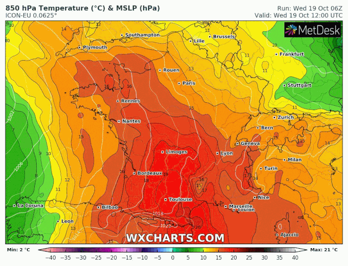 Masse d'air à 850 hPa (vers 1500m) du mercredi 19 au vendredi 21 octobre 2022 – via wxcharts.com