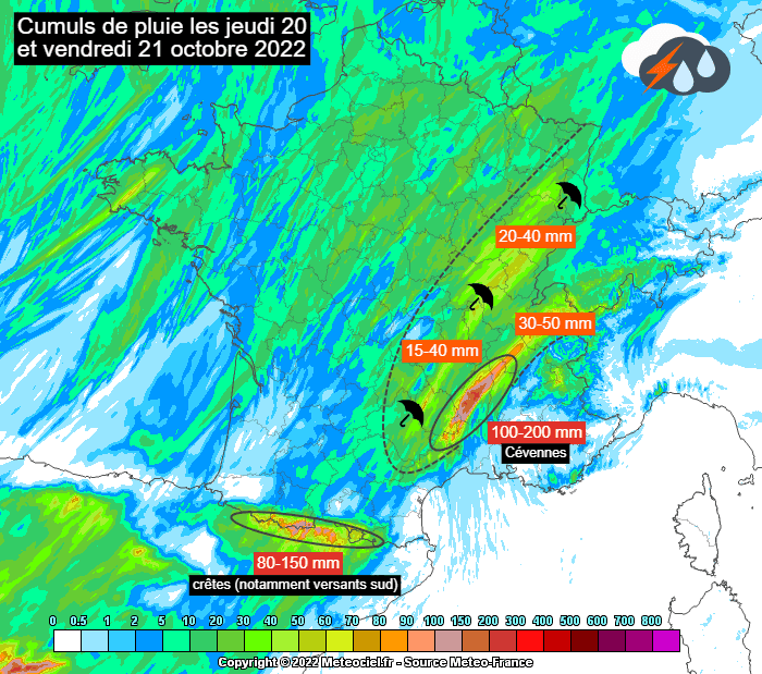 L'épisode pluvio-orageux se poursuivra durant la journée du vendredi 21 octobre 2022 dans le centre-est de la France. Les fortes pluies orageuses se décaleront peu à peu des Cévennes vers le nord des Alpes. Des pluies soutenues remonteront jusqu'au sud de l'Alsace tandis que les averses seront plus dispersées au nord-est. En parallèle, des averses parfois fortes et orageuses toucheront la pointe bretonne et le Cotentin. Elles seront accompagnées de rafales de vent atteignant 80 à 90 km/h sur les côtes !