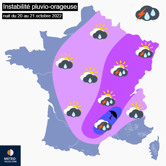 L'instabilité se prolongera durant la nuit du jeudi 20 au vendredi 21 octobre 2022. L'épisode cévenol continuera avec des pluies parfois orageuses. De nombreuses averses à caractère orageux vont aussi se former du Massif Central jusqu'au Grand-Est. Elles seront plus éparses entre le Limousin et la Belgique. Au cours de cette nuit, c'est en allant vers le sud-est du Massif Central (et notamment sur les régions cévenoles) que l'activité pluvio-orageuse s'annonce la plus importante.