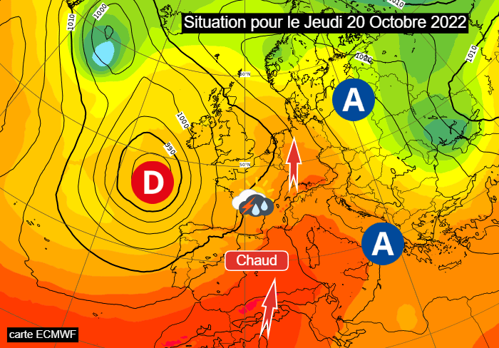 Une dépression très active est actuellement centrée au large de nos côtes atlantiques. Pendant ce temps, un anticyclone est solidement ancré entre le bassin méditerranéen et l'Europe Centrale. La France se retrouve ainsi en flux de secteur sud, advectant une masse d'air anormalement chaud pour la saison (records battus ces derniers jours). Durant les journées du jeudi 20 et du vendredi 21 octobre 2022, la dépression atlantique va quelque peu se rapprocher de la France, suffisamment pour déstabiliser la masse d'air au profit de pluies et d'orages.