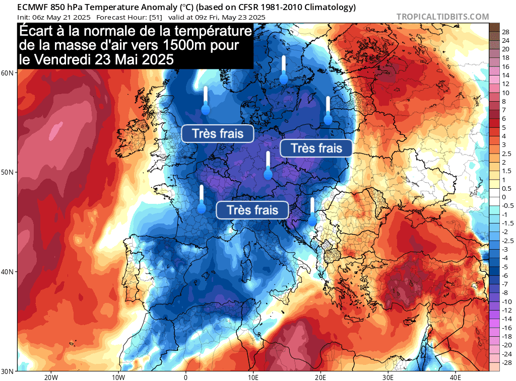 Ce vendredi 23 mai 2025, la température de la masse d'air vers 1500 mètres d'altitude se situera 7 à 9°C en dessous des normales de saison dans le nord-est de la France. Notons que l'Allemagne, la Pologne, la République Tchèque ou encore l'Autriche seront également touchées par cette coulée d'air très frais et vont aussi subir des gelées matinales.