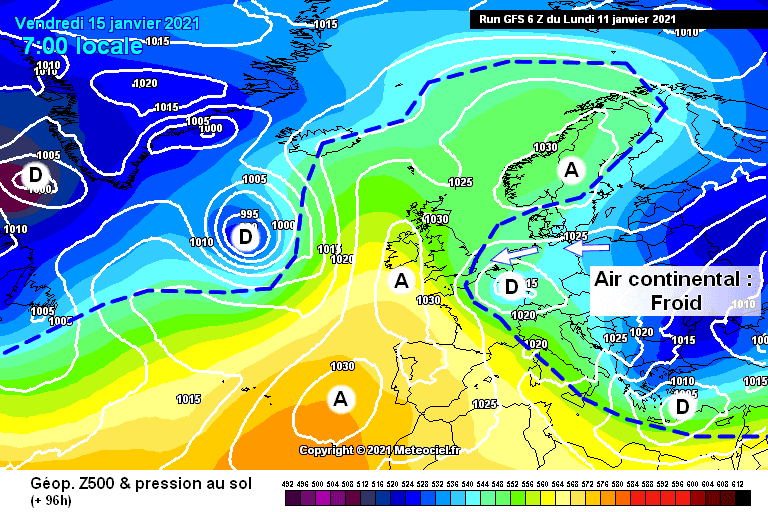 Schéma de la situation atmosphérique envisagée pour le vendredi 15 janvier – Modèle GFS via météociel.fr