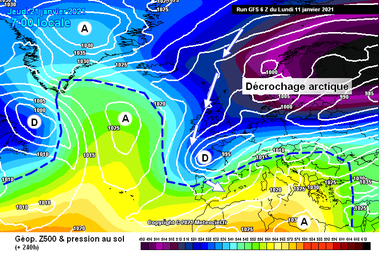 Schéma de la situation atmosphérique envisagée pour le jeudi 21 janvier – Modèle GFS via météociel.fr