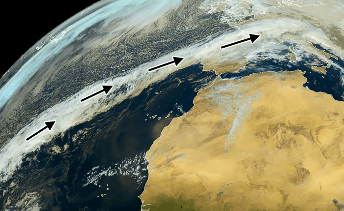 Généralement, la rivière atmosphérique est assez mince et fait quelques centaines de kilomètres de large. En revanche, sa longueur est massive, faisant plusieurs milliers de kilomètres en parcourant une grande partie de l'Atlantique et s'enfonçant parfois sur le continent européen. L'image satellite ci-dessous montre la France sous l'influence d'une rivière atmosphérique en décembre dernier. Parce qu'elles amènent une masse d'air d'origine tropicale et gorgée en humidité, ces rivières atmosphériques s'accompagnent généralement de précipitations abondantes et peuvent favoriser les inondations.