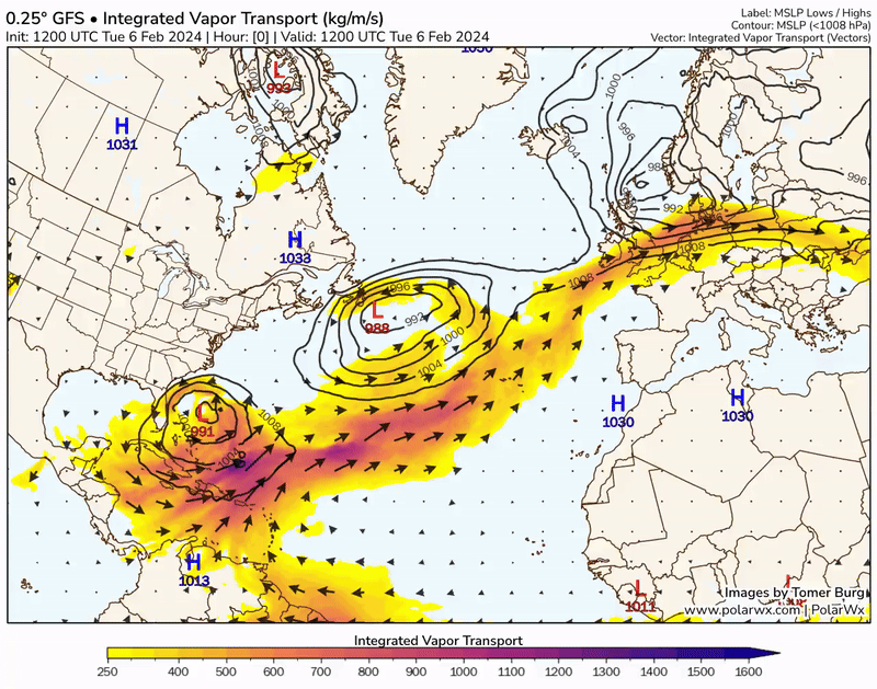 Quantités de vapeur dans l'atmosphère sur l'Atlantique du mardi 6 au jeudi 8 février 2024 - via polarwx.com