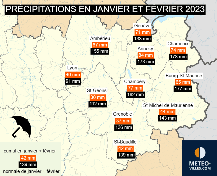 Cumuls de précipitations par rapport à la normale en janvier et février 2023 sur le nord des Alpes - Météo Villes