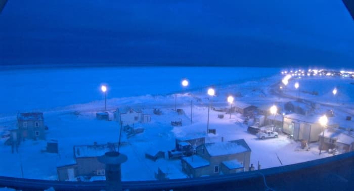 Encore un peu plus au nord, la commune de Utqiagvik en Alaska se situe à 71,2°N, environ 5 degrés au nord du cercle polaire. Les 5.000 habitants de cette ville n'ont pu bénéficier que d'un semblant de lumière du jour durant moins de deux heures. Il s'agit de la dernière latitude où la nuit noire n'est pas permanente. Le Soleil y reste néanmoins largement derrière l'horizon et sa lumière n'est même pas suffisante pour éteindre l'éclairage public... La nuit quasi-permanente !