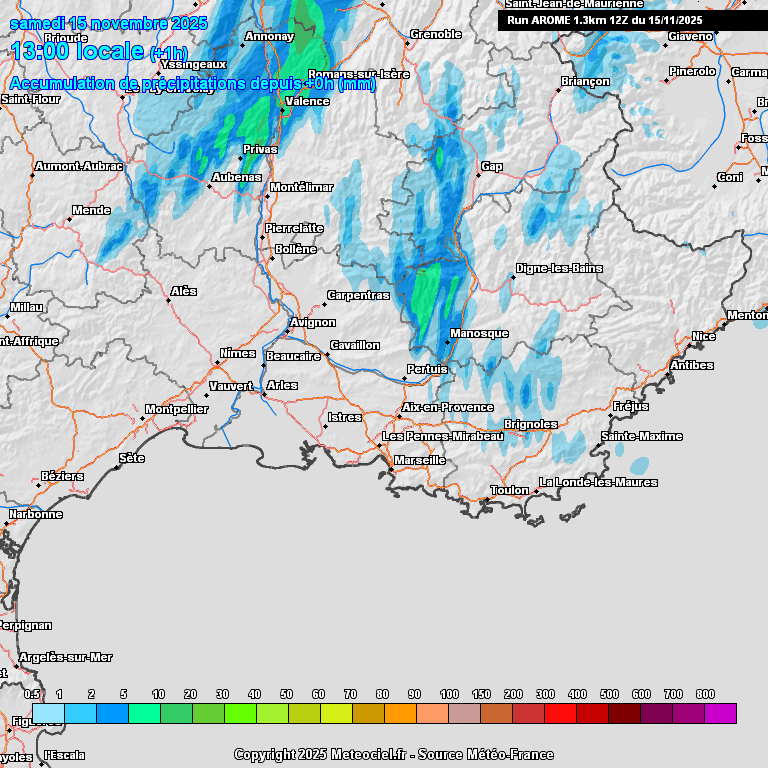 Les cumuls de précipitations prévus devraient être comparables à ceux enregistrés ces dernières heures sur les Cévennes ardéchoises, mais probablement supérieurs à ceux de samedi dans la Drôme et significativement plus importants dans l’arrière-pays azuréen, sur les hauteurs entre Fréjus, Nice et Menton.  Sur cette zone géographique, il est envisageable de dépasser largement les 100 mm en 24 heures.