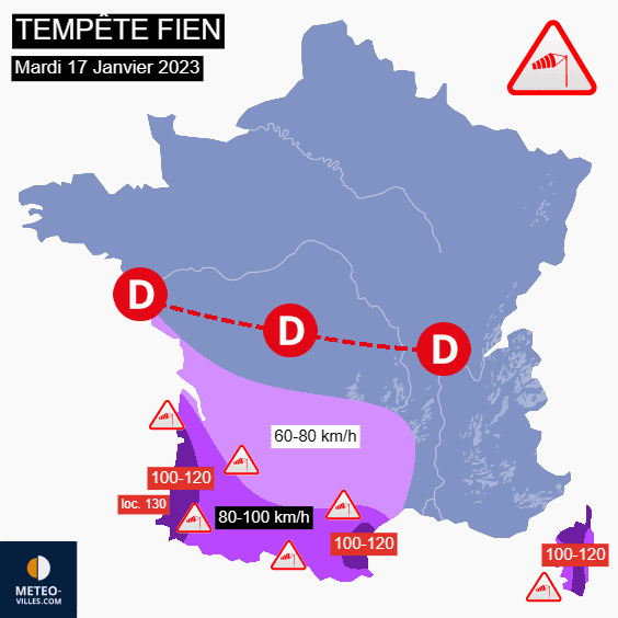 C'est en seconde partie de nuit du lundi 16 au mardi 17 janvier 2023 que les vents vont devenir tempétueux sur l'Aquitaine, particulièrement sur le sud de la région. Les rafales les plus puissantes souffleront en fin de nuit et en matinée de mardi de l'Aquitaine en direction du Roussillon, atteignant souvent 80 à 100 km/h dans les terres, très localement 110 km/h. Dans le domaine de la tramontane, des bourrasques de 100 à 120 km/h sont prévues. Il en sera de même sur la côte aquitaine avec des pointes pouvant aller localement jusqu'à 130 km/h ! Notons que ces rafales seront convectives et associées à de fortes averses. Elles perdront lentement en intensité en seconde partie de journée.