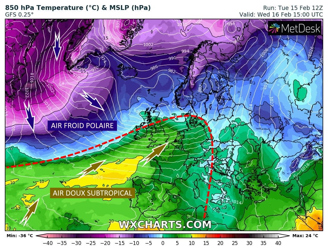 Masses d'air à 850 hPa (vers 1500m) ce mercredi 16 février 2022 - via wxcharts.com