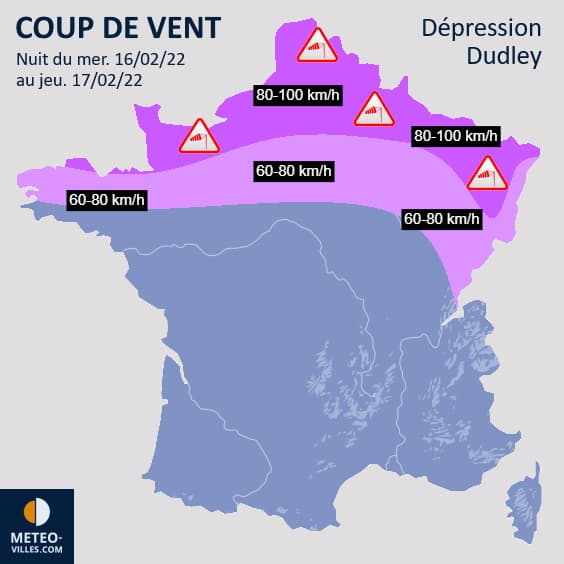 Les vents tempétueux vont surtout se manifester sur les Îles Britanniques et l'Allemagne. En France, on parlera plutôt d'un fort coup de vent sur les régions septentrionales. Durant la nuit du mercredi 16 au jeudi 17 février 2022, des rafales atteignant fréquemment 80 à 90 km/h sont prévues de la Normandie aux frontières belges et jusqu'aux Vosges, ponctuellement 100 km/h jusque dans l'intérieur des terres. Ces rafales nécessitent la prudence et ne se calmeront que jeudi à l'aube.
