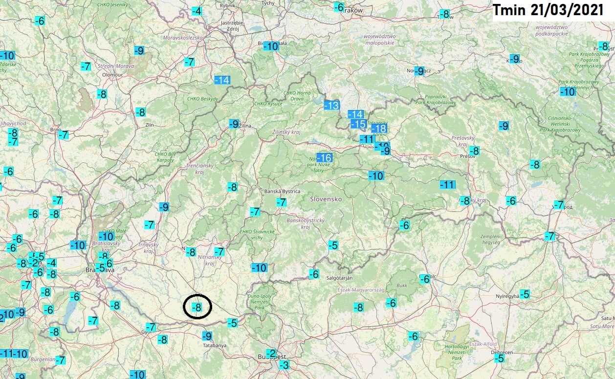 Températures minimales en Slovaquie le 21 mars 2021 – Via twitter : @EKmeteo